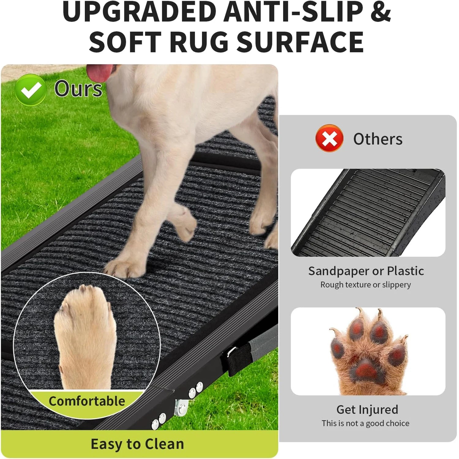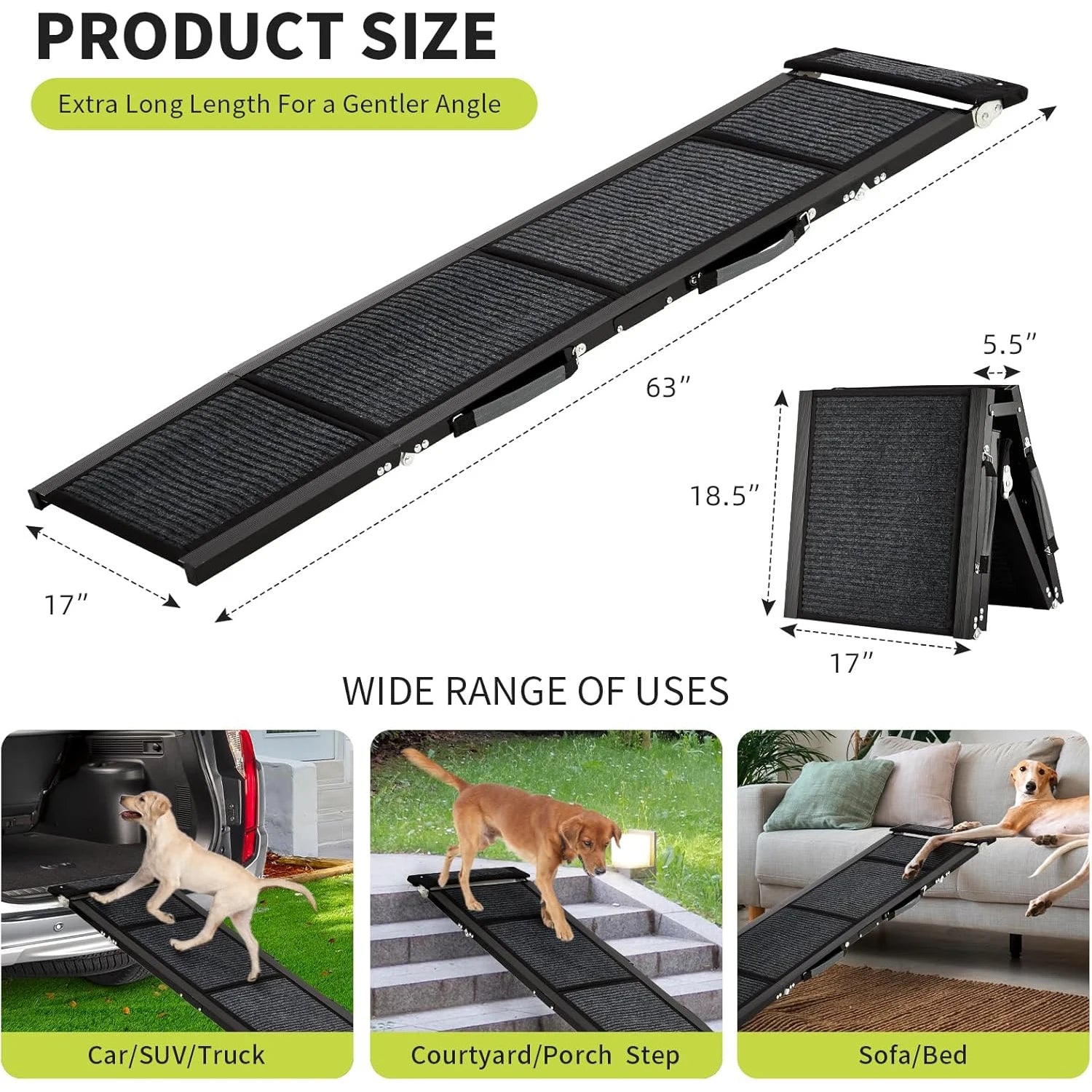 - Up to 250 lb weight capacity with an 18° incline and textured anti-slip grooves keep anxious or arthritic dogs confident on every step, ideal for SUVs, trucks, beds, or couches.